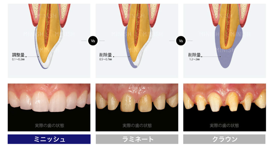 MINISHは可能な限り歯を削除せず強度、透明度、摩耗度などが自然歯に近い生体親和性に優れたセラミック修復物を使用し、歯の形態を整える治療法です。